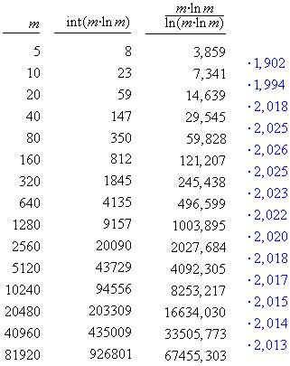 Nun fangen wir mal bei m = 5 an. Wir schauen, was die Primzahlmengen-Näherung uns sagt und verdoppeln das m dann jeweils. Folgende Tabelle kommt dabei heraus: