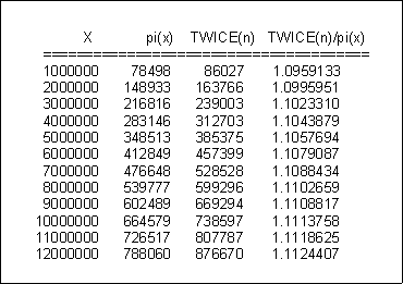 Hier noch eine Tabelle von Eugen Bauhof, welche aufzeigt, dass der Faktor, der Primzahlmenge mit Zwillingsmenge verbindet, offenbar konvergiert, also im Unendlichen einen ganz bestimmten Wert annimmt. Ähnlich wie x/ln(x) die Anzahl der Primzahlen unter den Ganzen Zahlen annähernd bestimmt, würde n * x/ln(x) die Anzahl der Primzahlzwillinge unter den Primzahlen annähernd bestimmen. Ich bin gespannt, wie groß dieser Faktor genau ist! Hier die Tabelle: